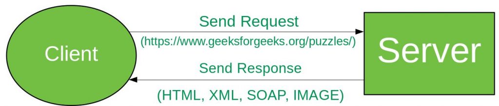 웹 앱을 이용하는 Client는 Server에 항상 request(요청)를 보낸다. 이 요청은 web URL의 형식으로 이루어지는데, 가장 많이 이용되는 요청의 종류는 HTTP GET, POST, PUT, DELETE 네가지로 나누어 볼 수 있다. request를 받은 Server는 Client에게 response(응답)를 하고, 이 응답은 HTML, XML, 이미지, JSON 등과 같은 리소스의 형식을 가지고 있다. 웹 서비스에서 최근 가장 많이 사용되는 리소스 형식은 json이다.