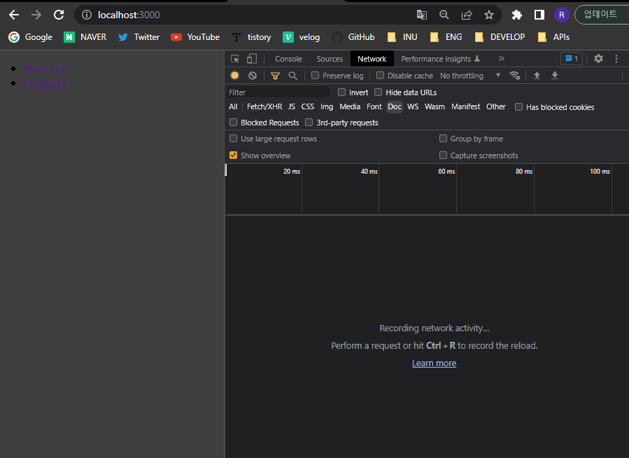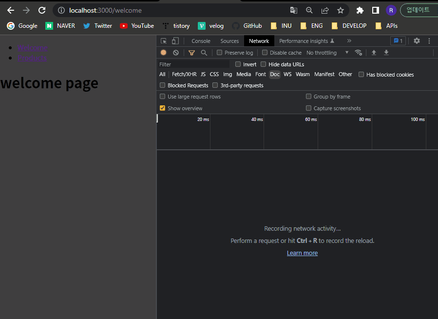 - ??? url에 /welcome 이나 /products를 입력하면, 새로운 요청을 보낸다.