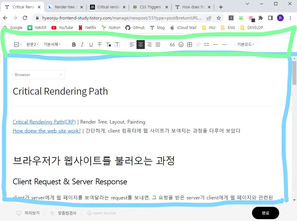 티스토리 블로그에서 글쓰기를 하는 웹 페이지의 layer는 왼쪽과 같이 나누어져 있다. layer는 브라우저의 엔진이 나눈 웹 페이지 요소 몇가지를 하나로 묶은 그룹인데, 우리가 css의 "will-change"라는 속성을 이용하면 엔진은 그 요소를 독립된 layer로 만들어 준다. 그 요소의 스타일이 변할 수 있다는 것을 의미하기 때문에, layer를 지정해서 따로 관리하겠다는 것이다. 이렇게 하면 나중에 그 layer의 스타일에만 변화를 주면 되기 때문에 효율적이다.
