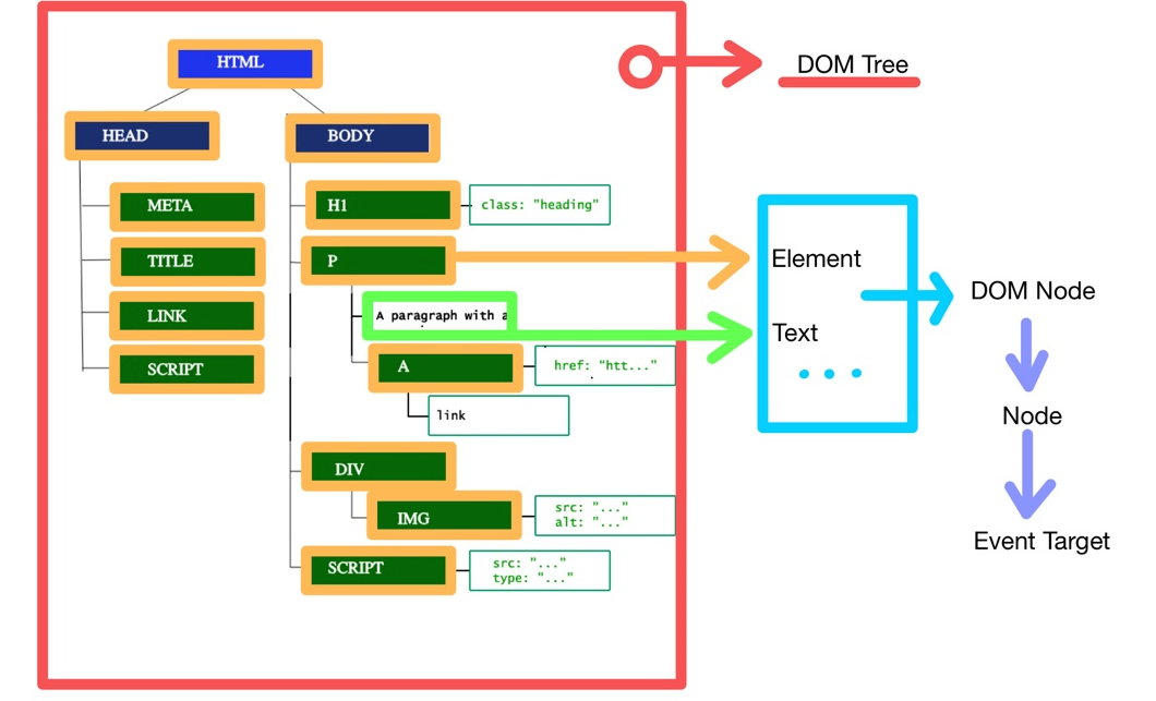 The DOM represents a document with a logical tree. Each branch of the tree ends in a node, and each node contains objects. The root of the hierarchy is EventTarget, that is inherited by Node, and other DOM nodes inherit from it.
