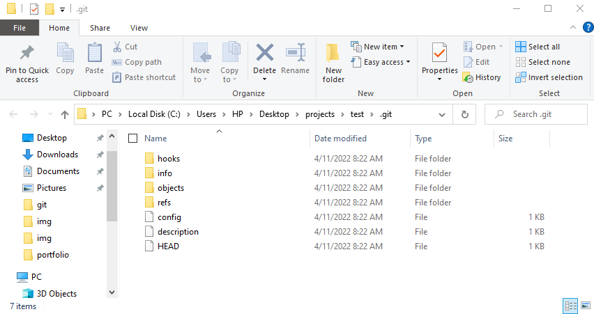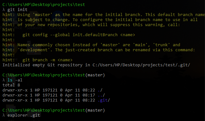 터미널에서 프로젝트가 포함될 directory에 "git init" 명령어를 입력하면, master branch와 ".git" 이라는 다양한 파일이 포함된 숨겨진 폴더가 생성된다. ".git"은 우리가 작업하는 코드의 버전 정보가 저장되는 곳이다.