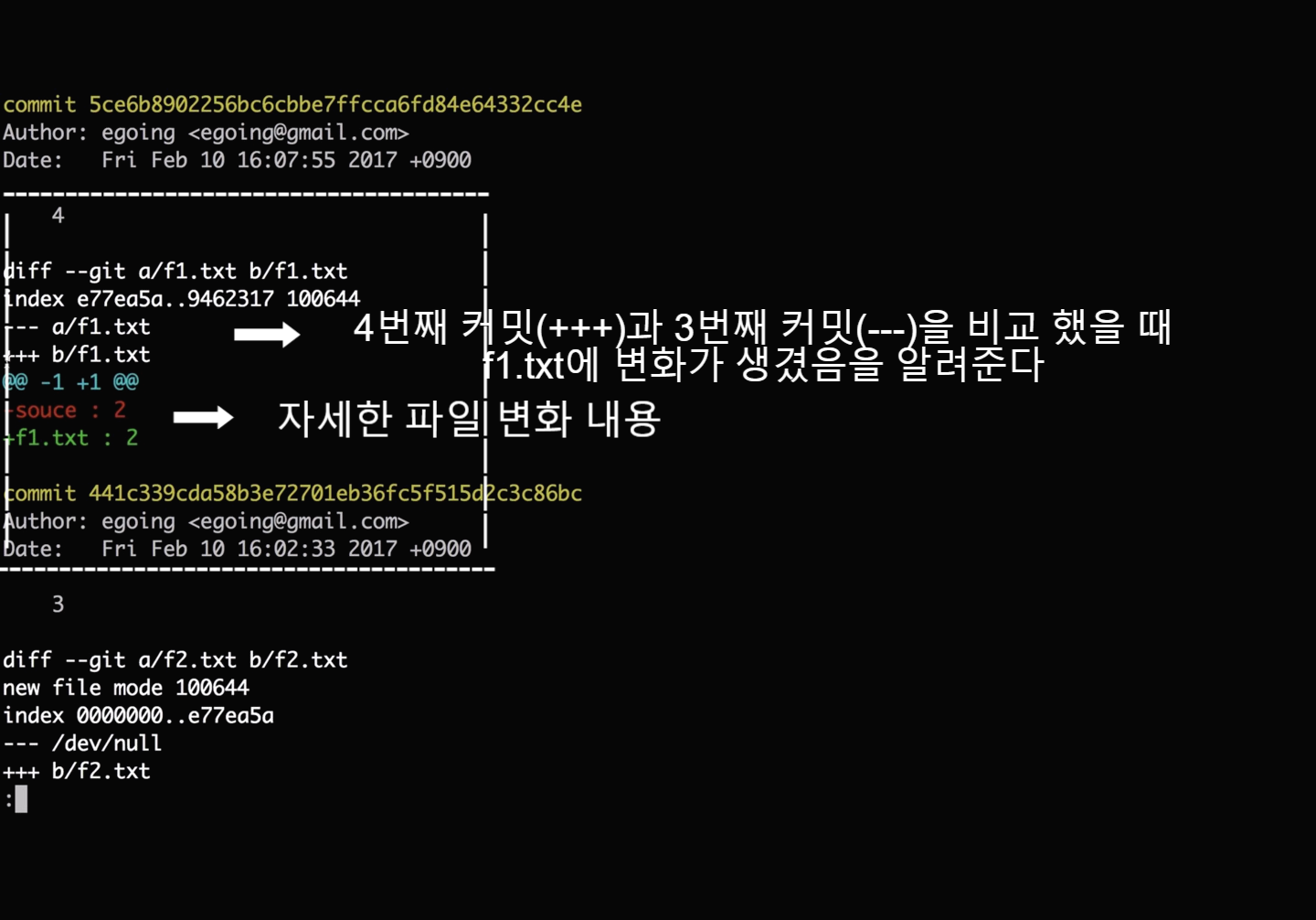 - git diff 해쉬코드1..해쉬코드2 | 두 커밋 사이의 모든 변경사항을 확인