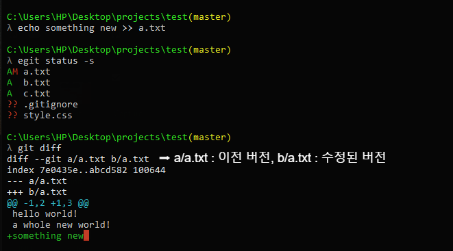 - a.txt를 add한 뒤에(staged), diff 명령어를 이용하면, 아무 output도 없을 것이다.