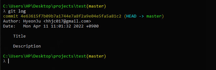 git log | 현재 branch의 모든 commit에 대한 히스토리를 최신순으로 확인할 수 있다.