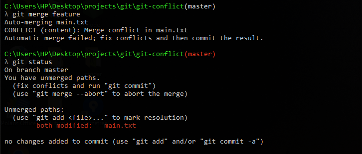 그런데 위의 그림에서는, 서로 다른 브랜치에서 같은 파일의 같은 line을 수정한 뒤 각각 커밋했다. 그런 다음 두 브랜치를 합병(merge)하려고 하자, 깃은 어떤 변경 사항을 반영해야 할지 자동으로 결정할 수 없어 conflict이 발생했다는 메세지를 출력했다.