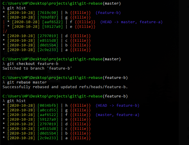 - git rebase master | feature를 master branch에 rebase(feature의 포인터를 d=>f)