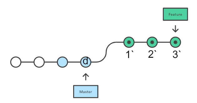 - feature 포인터가 참조하는 커밋을 변경하면(b->d), feature의 기존 커밋(1, 2, 3)과 내용은 같지만 다른 커밋(1`, 2`, 3`)으로 바뀐다. 즉, rebase는 항상 기존의 커밋을 새로운 커밋으로 만든다!