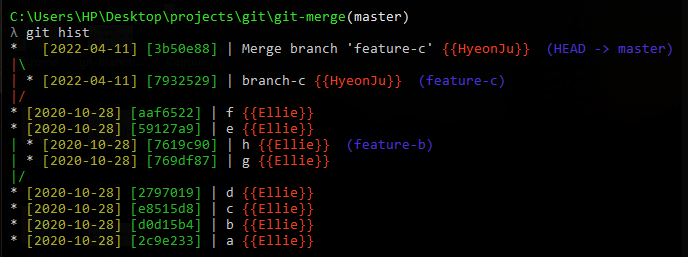 - 나는 hist에 git log --branches --decorate --graph --oneline를 등록해 놨다