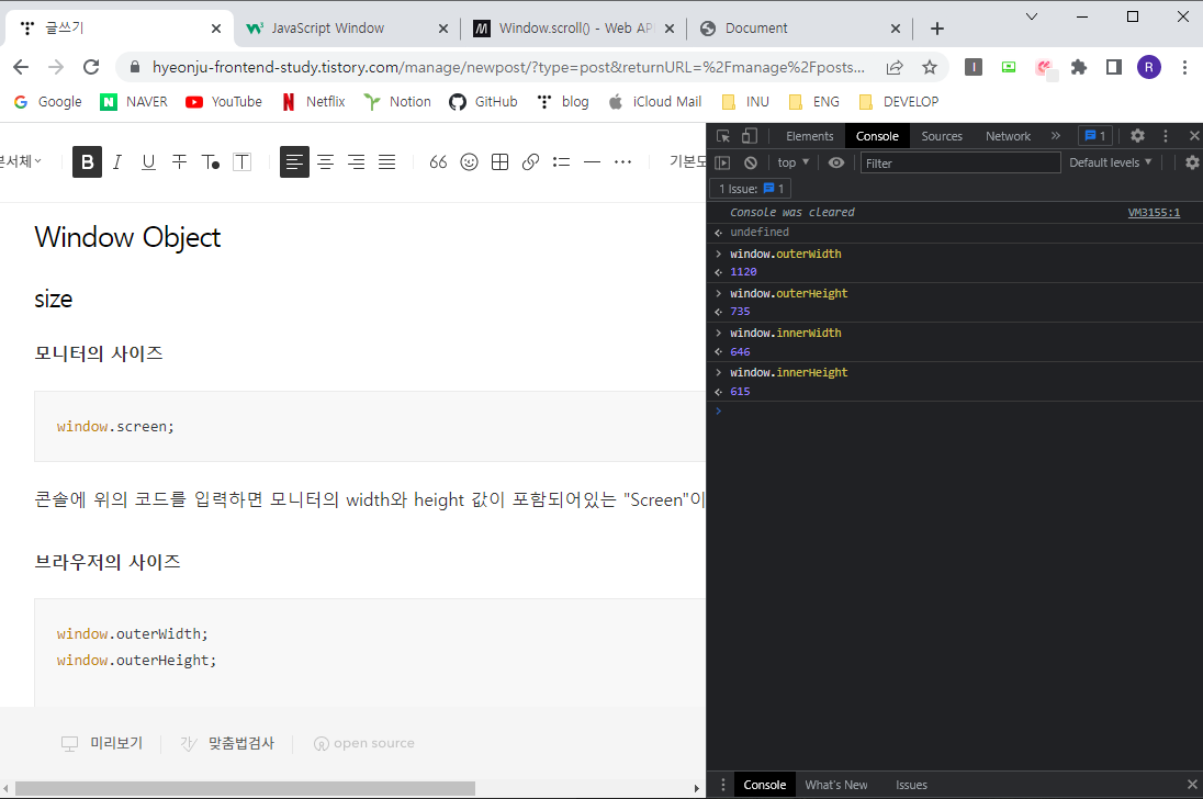 - inner는 outer값에서 주소검색창과 페이지 탭을 제외한 값을 말한다. 만약 브라우저에서 개발자 도구를 사용하고 있다면, 이 부분도 제외된다.