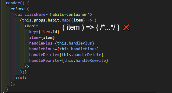 한가지 예를 더 들어보자. 아래의 코드에서 state에 있는 habits의 어떤 요소의 count를 1씩 증가시켜도, habits은 같은 배열 데이터이다. 게다가 PureComponent로 만들어졌기 때문에 count가 바뀌어도, state는 변하지 않았기 때문에 렌더링은 발생하지 않는다. 이것은 우리가 리액트에서 state를 직접 수정하지 않는 이유 중 하나이다.