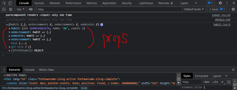 예를 들어 어떤 컴포넌트가 아래의 habit이라는 객체를 props으로 가지고 있다면, habit.count가 2나 3으로 변해도 habit이 참조하고 있는 메모리 주소는 변하지 않기 때문에, habit의 데이터가 바뀌었다고 판단하지 않는다. 즉 props에 변화가 없기 때문에, 이 컴포넌트가 pureComponent로 만들어졌다면 render는 호출되지 않는다. (그냥 component로 만들어졌다면, shallow고 뭐고 무조건 render를 호출한다.)