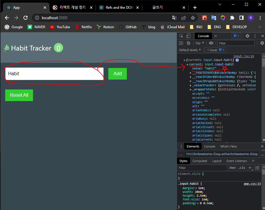 createRef의 호출 결과, 객체 데이터가 출력된다. 이 데이터의 current에는 우리가 inputRef가 연결되어 있는 속성의 주인 태그인 input 태그 요소가, 이 요소의 value에는 input에 현재 입력되어있는 'Habit'이라는 유용한 데이터가 각각 들어있다.
