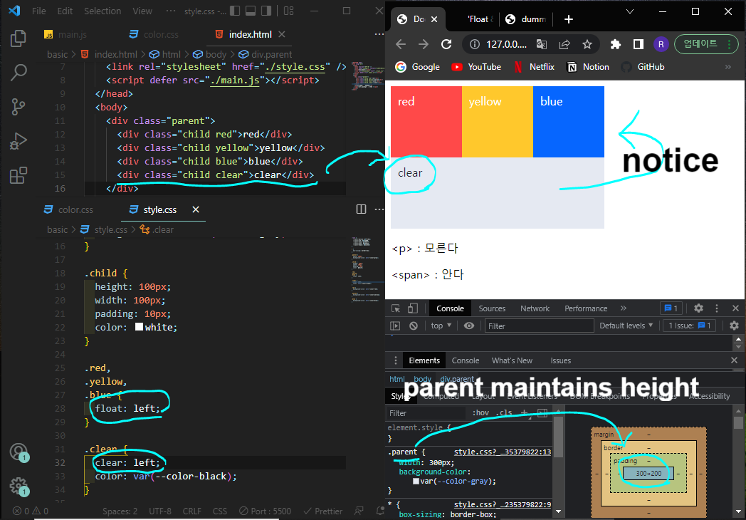 clear: left 속성을 이용하면, 같은 자식 요소 중에 float: left를 적용한 요소의 존재를 알아차릴 수 있다(right, both 값을 적용할 수 있다). 그렇기 때문에 child2는 child1이 원래 있었던 자리를 차지하는 것이 아니라, 원래 있어야 할 위치를 지키게 된다. 부모 요소는 child2의 위치를 정확히 알 수 있기 때문에, height을 child1 + child2의 값으로 알맞게 유지한다.