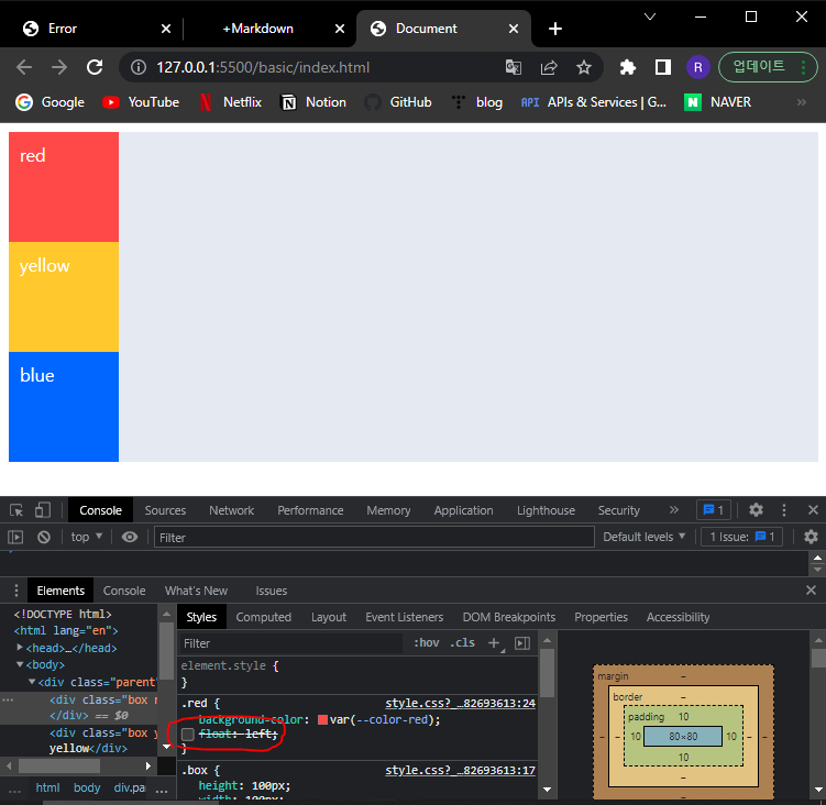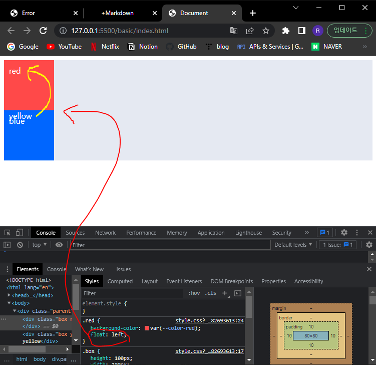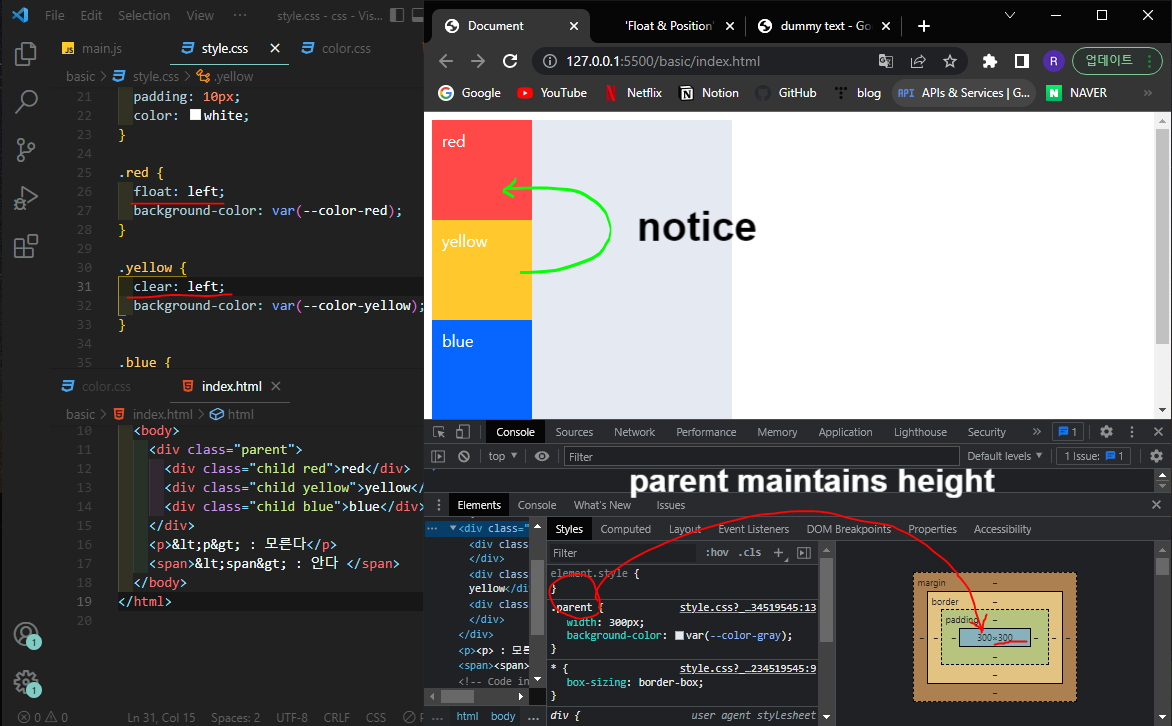 - block 요소들은 float 속성을 적용한 요소를 없는 것처럼 취급 하지만, 텍스트나 이미지 등과 같은 inline 요소들은 float 요소의 존재를 알고 있다. ??? 그래서 아래의 'yellow' 텍스트는 원래 자리에 남아있는 건가?
