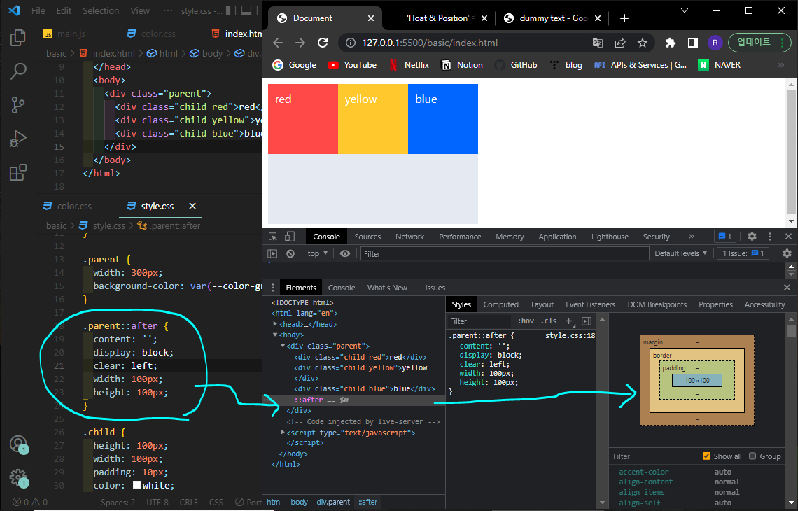 clear라는 새로운 자식 요소를 추가해서 parent가 높이를 유지하도록 만들 수 있다. 하지만 이 방법은 스타일링을 위해 html에 div 요소를 추가하는 것이므로, semantic html markup의 관점에서 좋지 않은 방법이다. css의 pseudo element(가상 요소)를 이용하면 이런 문제를 해결할 수 있다. 가상 요소는 html 요소는 아니지만, 스타일링을 위해 화면에 표기되도록 만들 때 이용할 수 있다. 반드시 content라는 속성 값을 지정해야 한다.