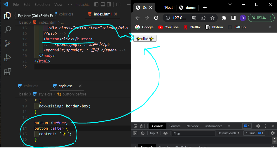 - 만들어지는 가상 요소의 box type은 inline이므로, 이 요소에 width, height이나 위, 아래에 margin, padding을 설정해야 하는 경우에는 display: block을 적용해야 한다.