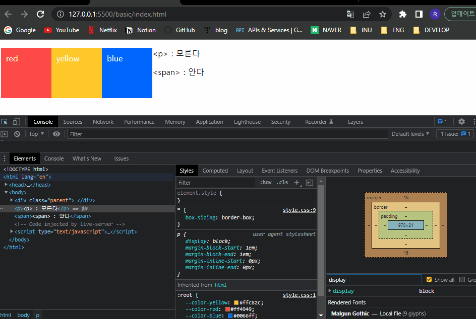 - block 요소들(ex. <p>)은 float 속성을 적용한 요소의 존재를 모르지만, inline 요소들(ex. 텍스트, <span>)은 알고있다.