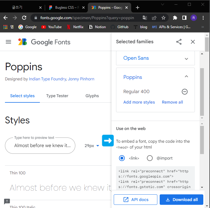 그림에서 나타난 코드를 html의 head 태그 내부에 작성하면 해당 폰트를 웹 사이트에 적용할 준비가 된 것이다.