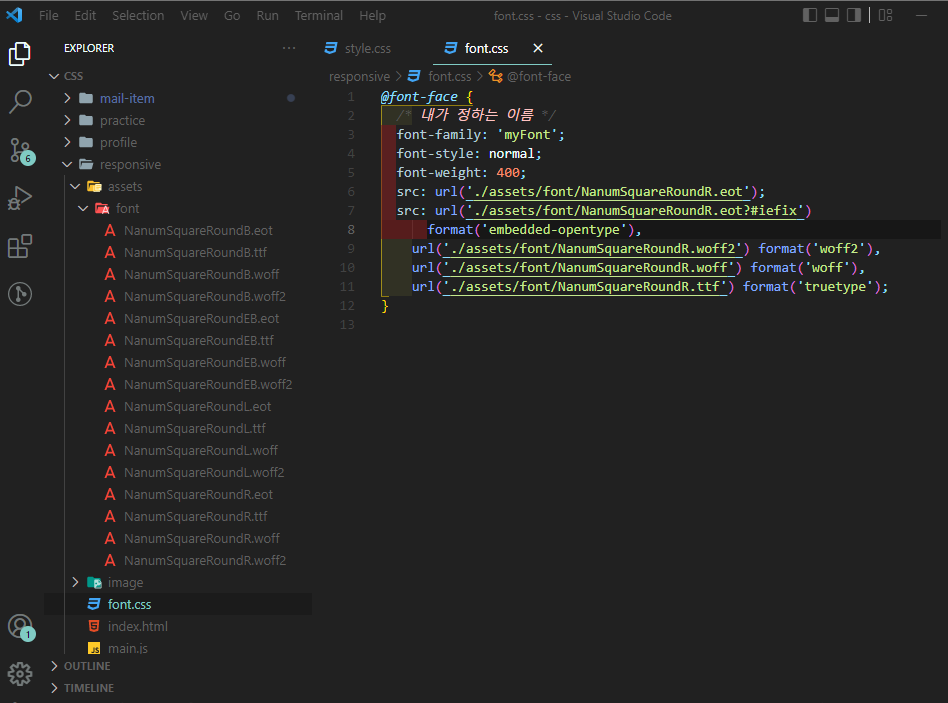 - font.css라는 파일에 사용하고자 하는 폰트 파일을 연결한다.